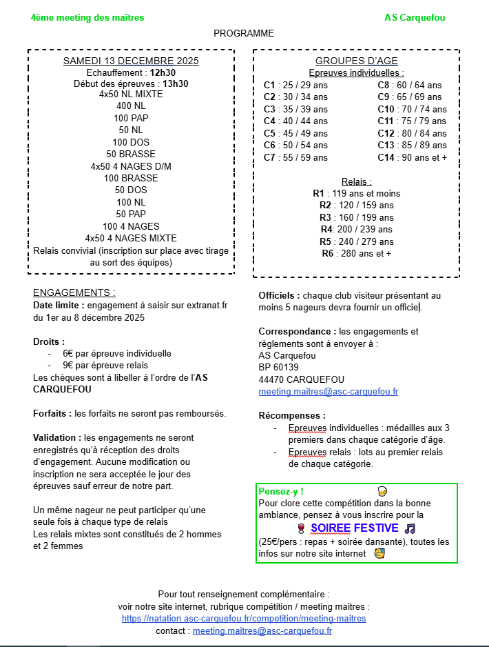 C’est pourquoi il est demandé à tous les clubs participants, même ceux qui avaient déjà fait la saisie de leurs engagements sur Extranat, de nous envoyer la liste de vos engagements par email à meeting.maitres@asc-carquefou.fr, en précisant pour chaque, les noms prénoms et date de naissance des nageurs, les temps d’engagement de chaque nage, l’ordre des nageurs dans les relais. Merci de le faire au plus vite afin que l’on puisse établir le programme